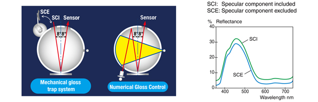 Al disparar dos lámparas de xenón en sucesión rápida, el sistema de Control Numérico de Brillo (patentado) de los equipos CM-3600A y CM-3610A elimina la necesidad de una trampa mecánica de brillo, obteniendo a su vez mediciones SCI y SCE virtualmente simultáneas y permitiendo el cálculo de brillo a 8.